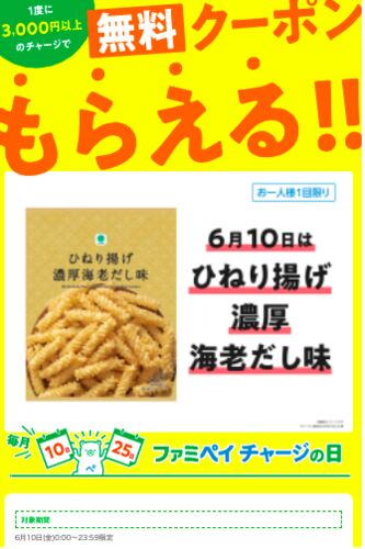 毎月10日,25日はファミペイチャージの日。 3,000円以上チャージするとなにかもらえます。 今日6/10は「ひねり揚げ濃厚海老だし味」です。 www.itmedia.co.jp www.watch.impress.co.jp クーポンが2週間ぐらいあとに付与されます。 毎月ファミマで3千円、6千円…