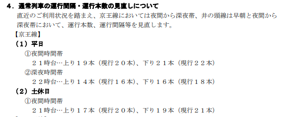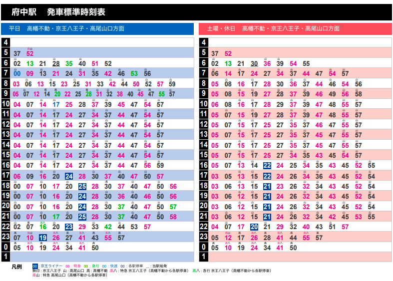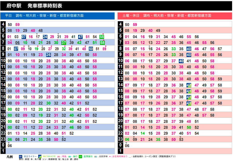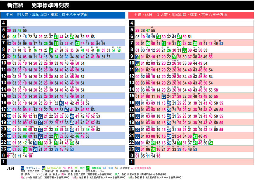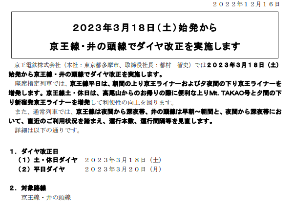 2023-03-18 京王線のダイヤの記録 2023年3月18日改正 京王ライナー朝の上り、夕の橋本行きを増発・深夜若干減便 京王 京王線のダイヤ改正を記録します。 https://www.keio.co.jp/news/update/news_release/news_release2022/nr20221216_daiyakaisei.pdf (京王はリリースを3年程度で消してしまうので記録します) ■新宿下り ■府中下り ■府中上り ◆新宿発22時台,23時台の比較 上:旧ダイヤ 下:新ダイヤ 旧ダイヤの22:16の特急高尾山口、22:21の各駅停車高幡不動行きにあたるものが減便。 京王線方面は、22:12の急行京王八王子行きから22:30の特急京王八王子行きまで18分あく。