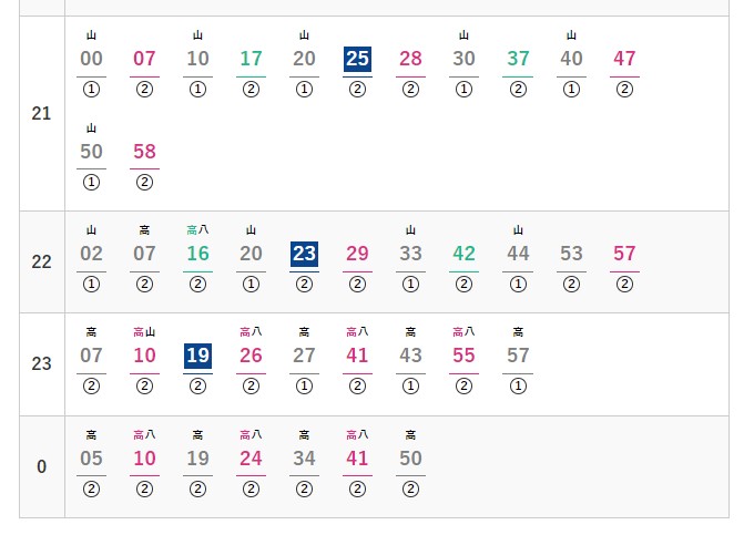 21:30以降の高幡不動以西は本数が減り輸送力減少になる。